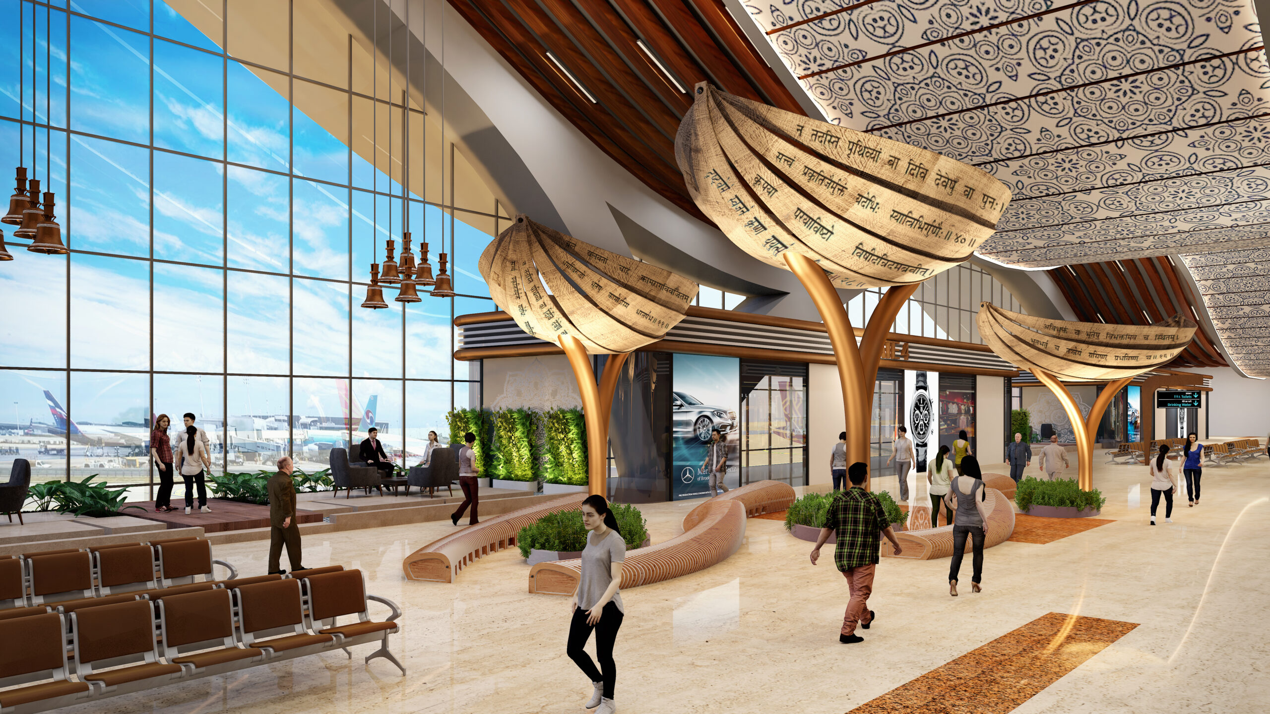 Then we started playing in the interiors where we have showcased the various artforms maybe a boat perhaps a hanging boat and then creating the Sanskrit Hindu shlokas from the Vedas.And then we talk about various false ceiling patterns and flooring patterns in terms of the carpets and silk sarees which gave a spoken language of the city transformed into architecture, art, structures and defining the spaces which gives me a feeling of the various elements when I land at Varanasi Airport.