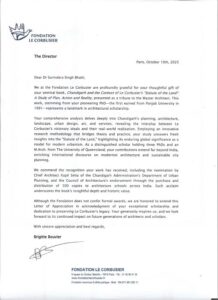He recently received a letter of appreciation from Fondation Le Corbusier for his book ‘Chandigarh and the Context of Le Corbusier’s ” Statute of Land” A Study of Plan, Action & Reality’.